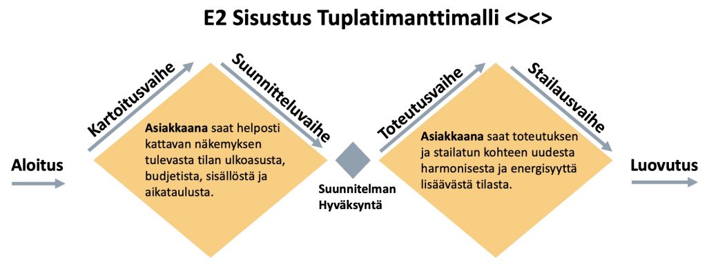 E2 Sisustuksen toiminta pohjautuu tupla timanttimalliin <><>